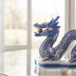 Blue and off white porcelain dragon with metallic gold details, hand painted.