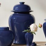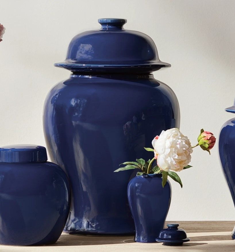 With a deep navy high gloss glaze, this lidded ginger jar is steeped in tradition. A perfect complement to the blue and white trend, and a solid choice to mix in among your patterned pieces in a bookshelf or on a credenza for a dynamic look.