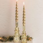 Set of two hand-painted wax taper candles. Comes gift boxed in kraft displayer.