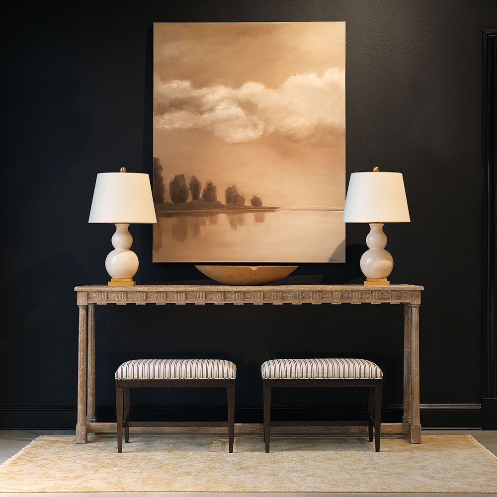 A rectangular upholstered seat rests over side rails that are overlaid with lacey pierced fretwork. The bench is raised on square tapering posts.