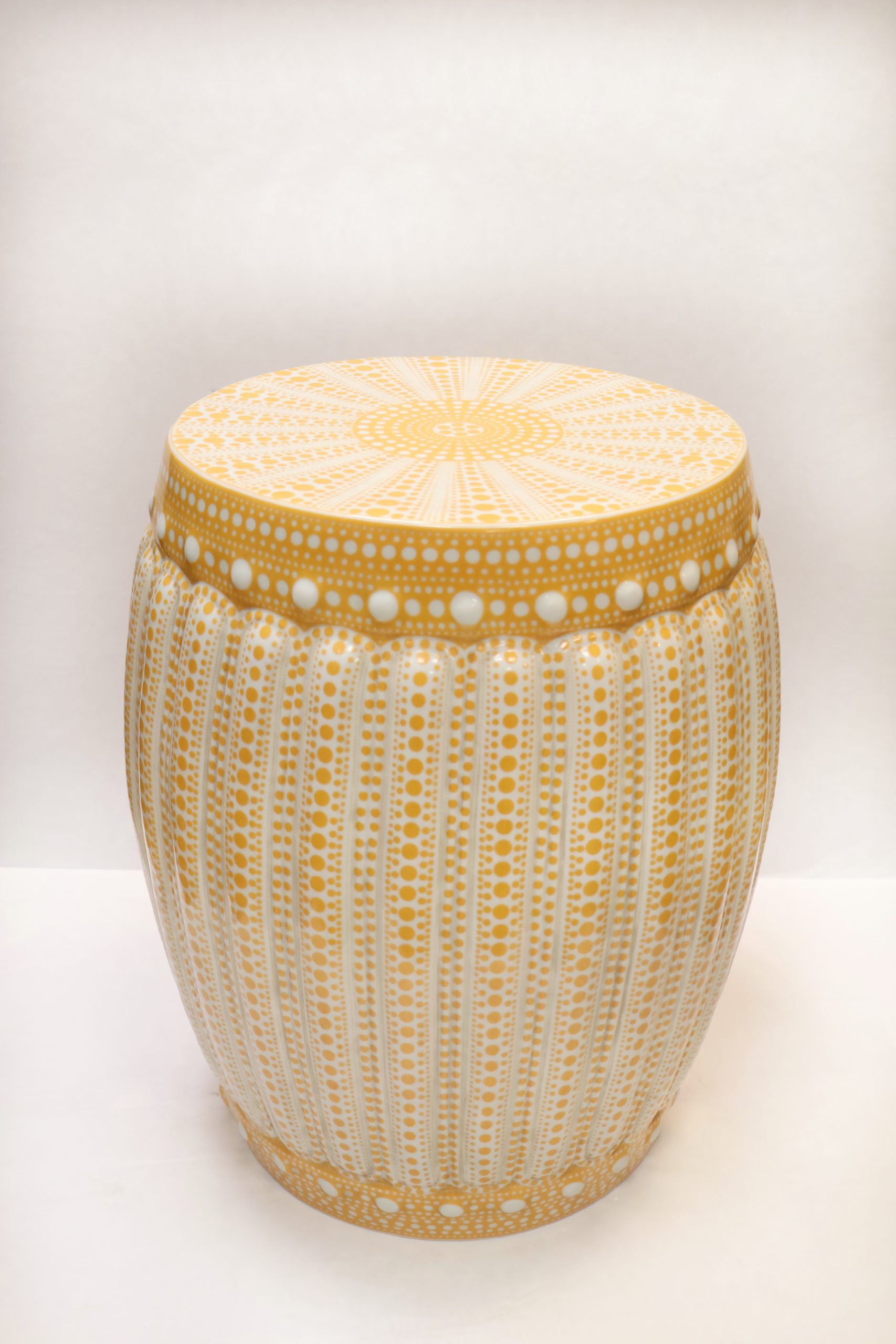 Fine porcelain solid ribbed stool. White with yellow dots.