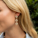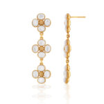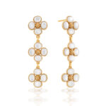 A trio of clovers descend in linear fashion for an effect that’s equally streamlined and romantic. Made with iridescent mother of pearl orbs and golden berry centers, this set brings femininity and a little luck to carry with you wherever you go.