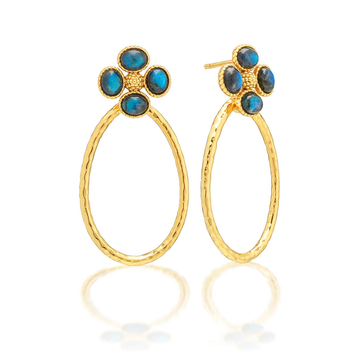Description: Shimmering hammered gold teardrop hoops dangle from clover-shaped studs of luminous blue labradorite. With understated elegance, this irresistible pair of earrings knows precisely how to make a subtle statement, whether it’s a day at the office or a night out on the town. Lucky you!