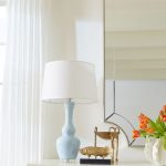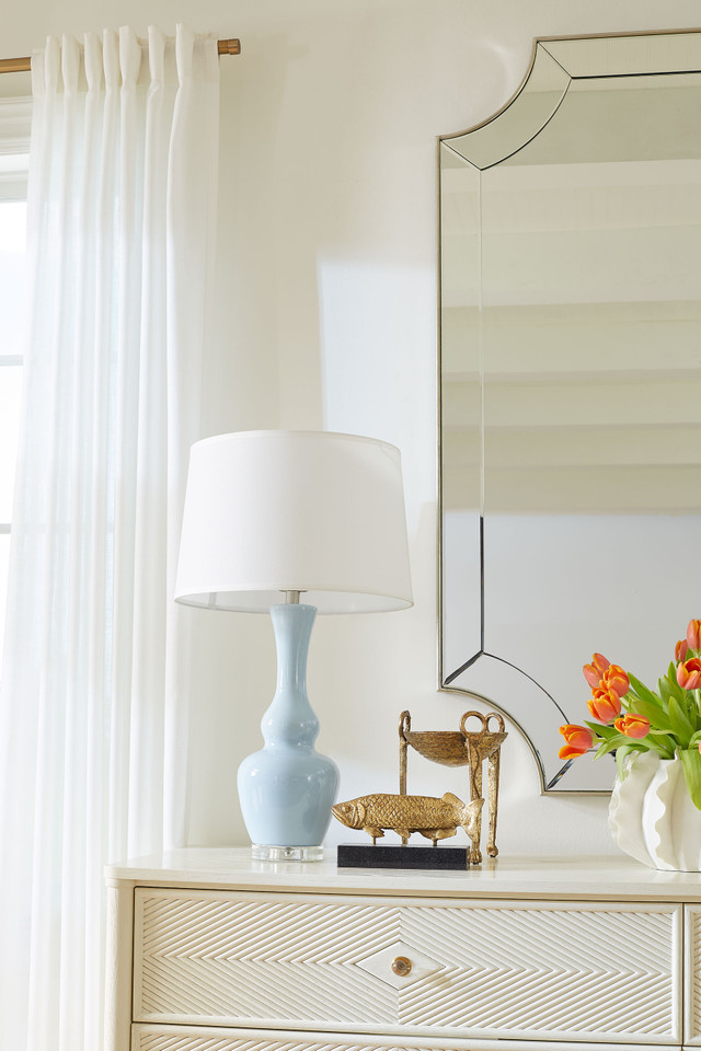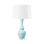 The Ansonia Lamp has a thin double-gourd silhouette complemented by a long, slender neck, creating a graceful and timeless profile. Crafted from ceramic with a glossy opaque glaze, the lamp exhibits a polished finish. It rests on a clear acrylic base and is topped with a matching acrylic ball finial, adding a touch of modernity. The nickel harp completes the design, ensuring both style and durability.