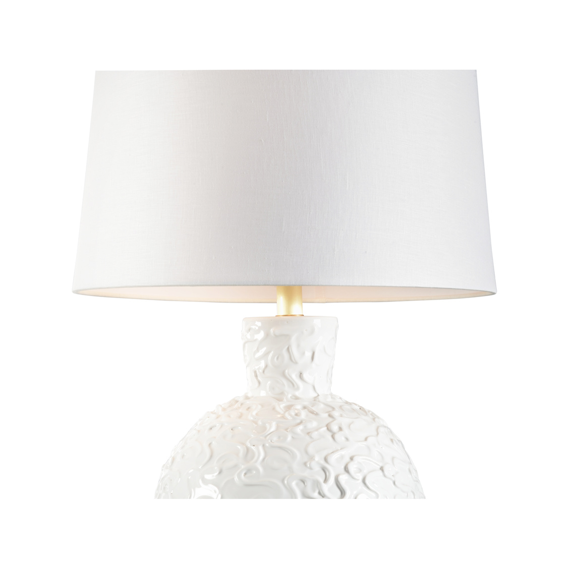 Hand crafted in Italy, capellini lamp features a subtle relief pattern that creates texture and movement on the round, white glazed ceramic body. An off white linen empire shade and acrylic ball finial complete this versatile design and provide a perfect addition to a console in an entryway, a side table in the living room or a nightstand in the bedroom. Due to the hand made nature of this product, patterns may vary.