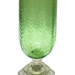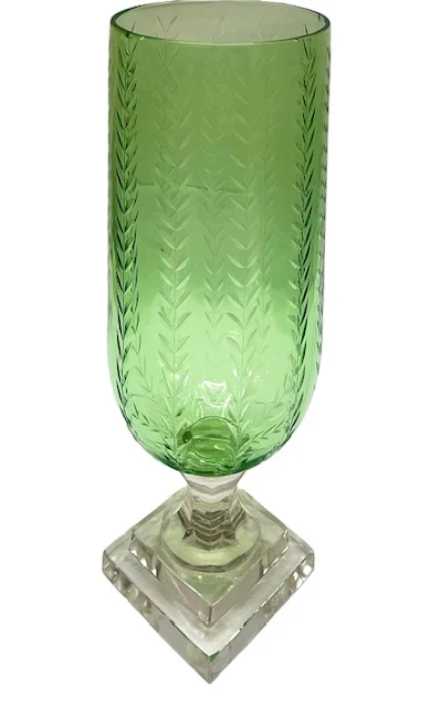 Uncover a unique, artisanal hurricane adorned with a breathtaking leaf motif, crafted from light green mouth-blown glass.