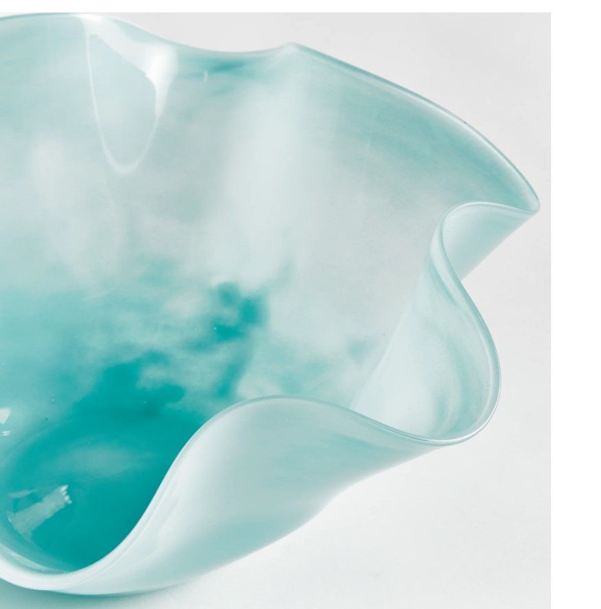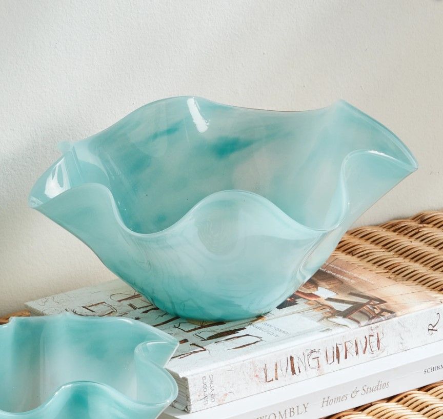 A modern update to the open glass form, our mouth blown organic bowl is made with pot color, not sprayed. A soft light blue watercolor-inspired look. A soothing pop of color to complete your side table, coffee table or ottoman.