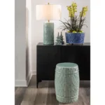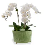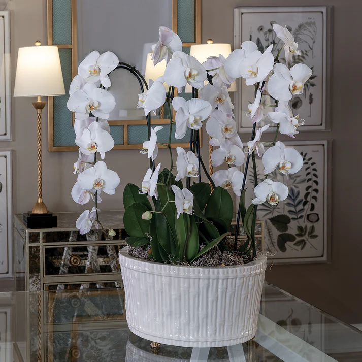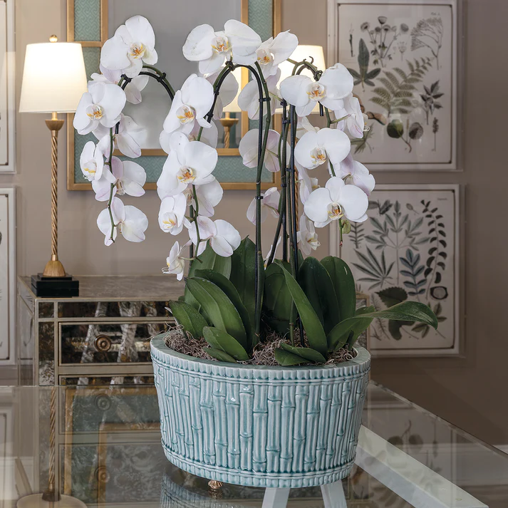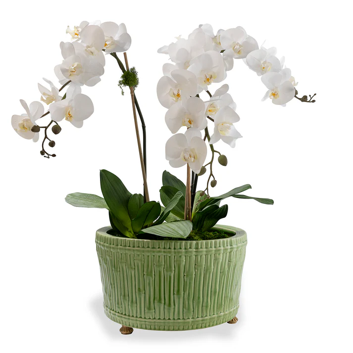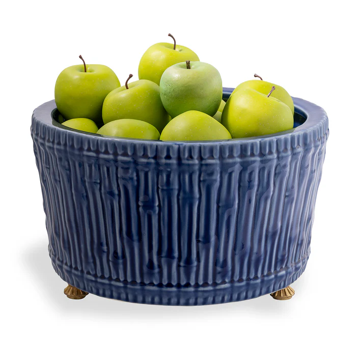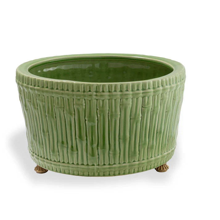 Grand, casual and timelessly traditional would describe our round 15″ diameter bamboo garden center basin. Perfect for the hall, dining or cocktail table when displaying orchids or a mass of florals. We also like to pile up fresh apples or oranges for a simple, yet elegant statement of color. Accented with solid brass feet, the center basin features carved bamboo into the mold of the porcelain planter.
