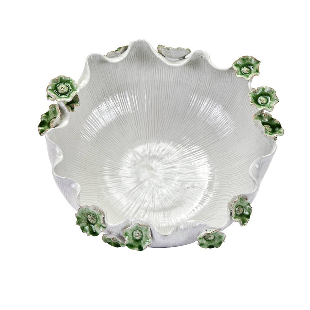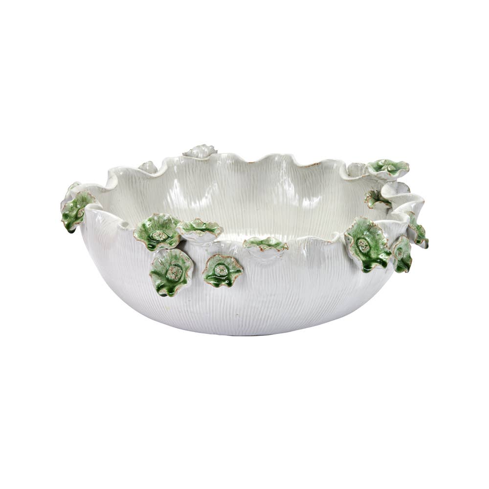 Looking for unique, handmade tabletop magic? This 19-inch stunner, handcrafted in sun-drenched Thailand, is far more than just a bowl – it’s a blooming conversation starter! Imagine: White Thai ceramic, smooth as river stones, whispering of ancient techniques. Then, BAM! Vibrant emerald flower stems erupt from its heart, like a spring symphony frozen in clay. Each one unique, like nature’s own brushstrokes, dancing with playful exuberance. Are they Lily whispers, trapped in the cool earth? Or bougainvillea, bursting with tropical joy? The mystery is yours to discover! This isn’t just tableware, it’s an experience: Dining centerpiece: Picture this beauty overflowing with exotic fruits, casting emerald shadows under candlelight. Timeless treasure: Handcrafted with generations of skill, this heirloom piece whispers stories in every touch. It’s a reminder that beauty lies in the handmade, a piece of Thailand for your home. Hand Crafted in Thailand Approx. 15′ ” wide, 6″ Deep
