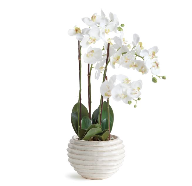 With a reactive glaze and hand finished ribbing detail, this charming white pot is a great find. Plant your favorite lush greens or prized orchids & watch them flourish in style.