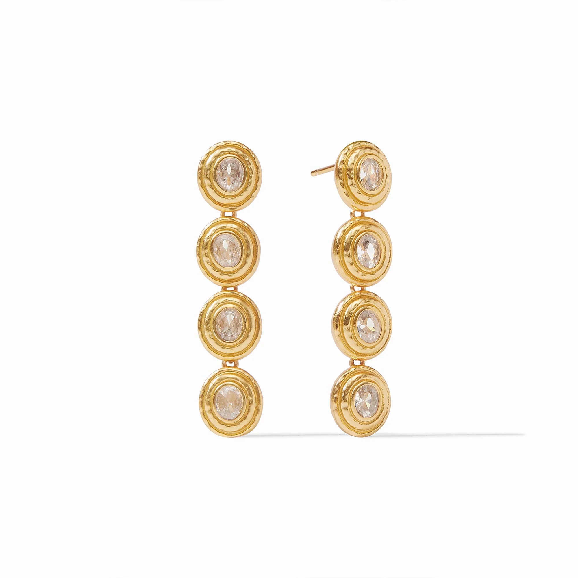 Four oval rose cut gemstones are set in lightly hammered golden walls and linked together for a dramatic earring that moves with you.