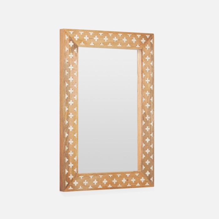 This mirror has a simple, white oak frame that showcases the beauty of bone inlay- a technique artisans have perfected over centuries. By contrasting a delicate floral pattern against natural wood grain, this flat mirror quietly brings drama to any space.