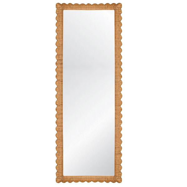 The scalloped rattan floor mirror is bordered by a series of scalloped edges meticulously woven using high quality rattan material. Measuring generously in size, the mirror is designed to be versatile and can be hung both horizontally and vertically. The floor mirrors versatile nature allows it to seamlessly blend with various interior styles, from coastal and bohemian to modern and eclectic.