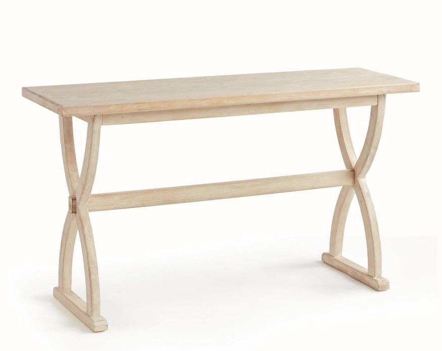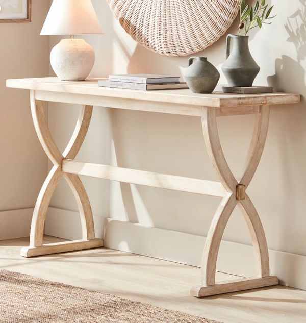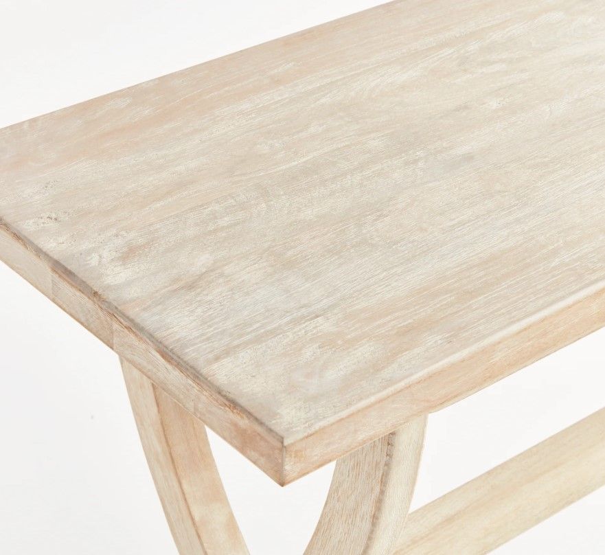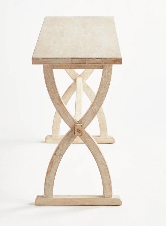 With transitional lines and a bowed crisscross base, this generously scaled mango wood console is a modern interpretation of the classic farmhouse table. Finished in a light whitewash, it is a real stunner. Style with a few books, an objet or vase, and place it in the front entryway or behind the sofa.