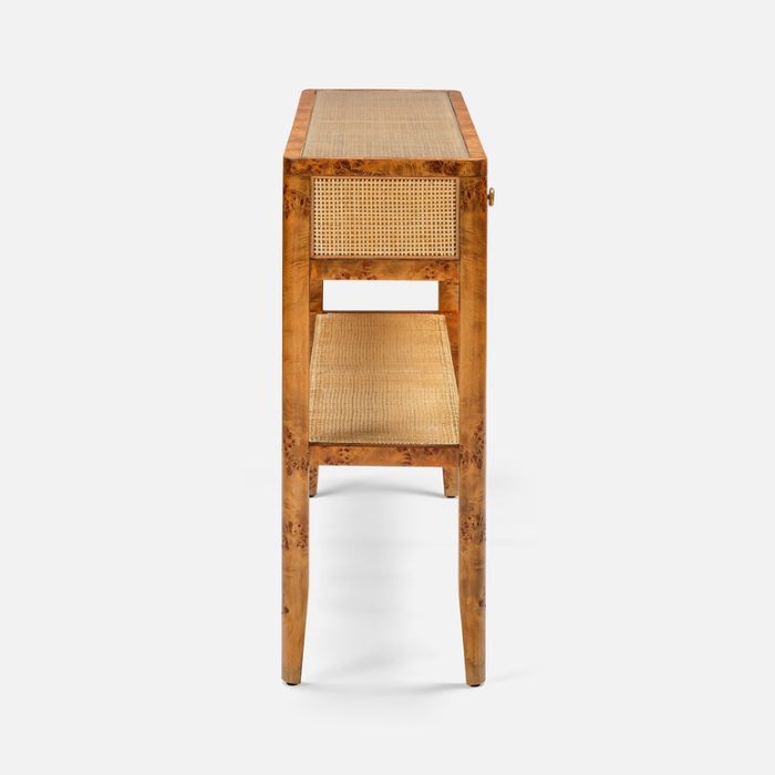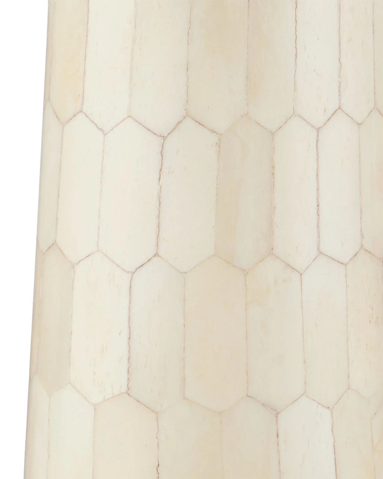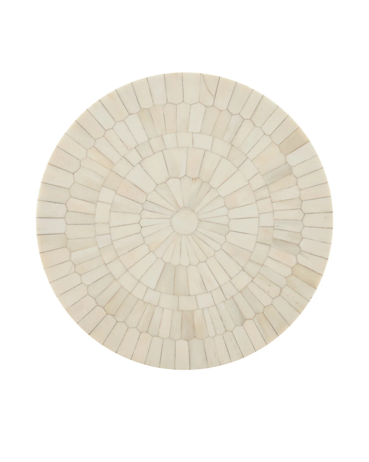 The Bone Drinks Table is a work of art, with its surface covered in over 400 pieces of natural bone that were ground into picket-tile shapes before being applied. The precision required to place the pieces so perfectly is a painstaking process. The plinth base on which the ivory drinks table sits is also covered in bone.