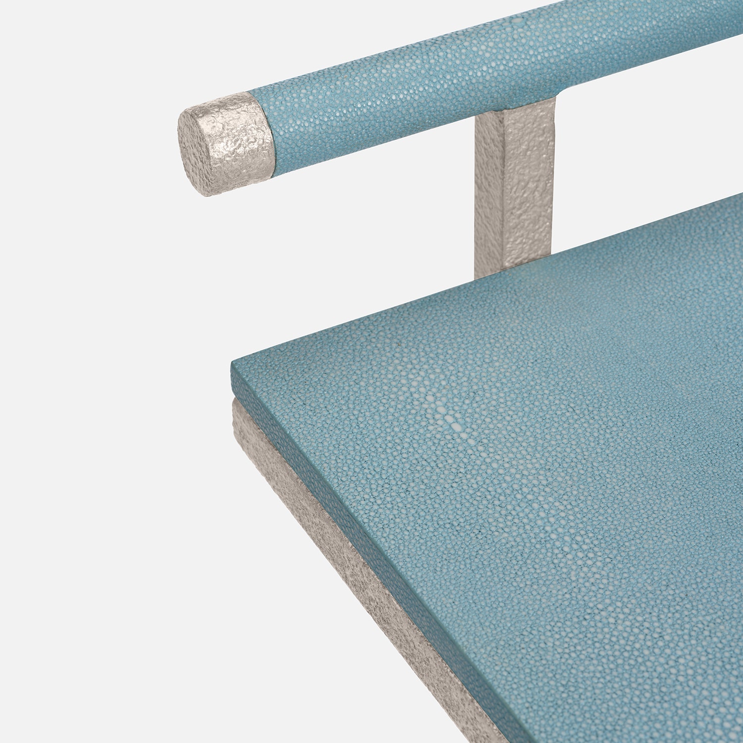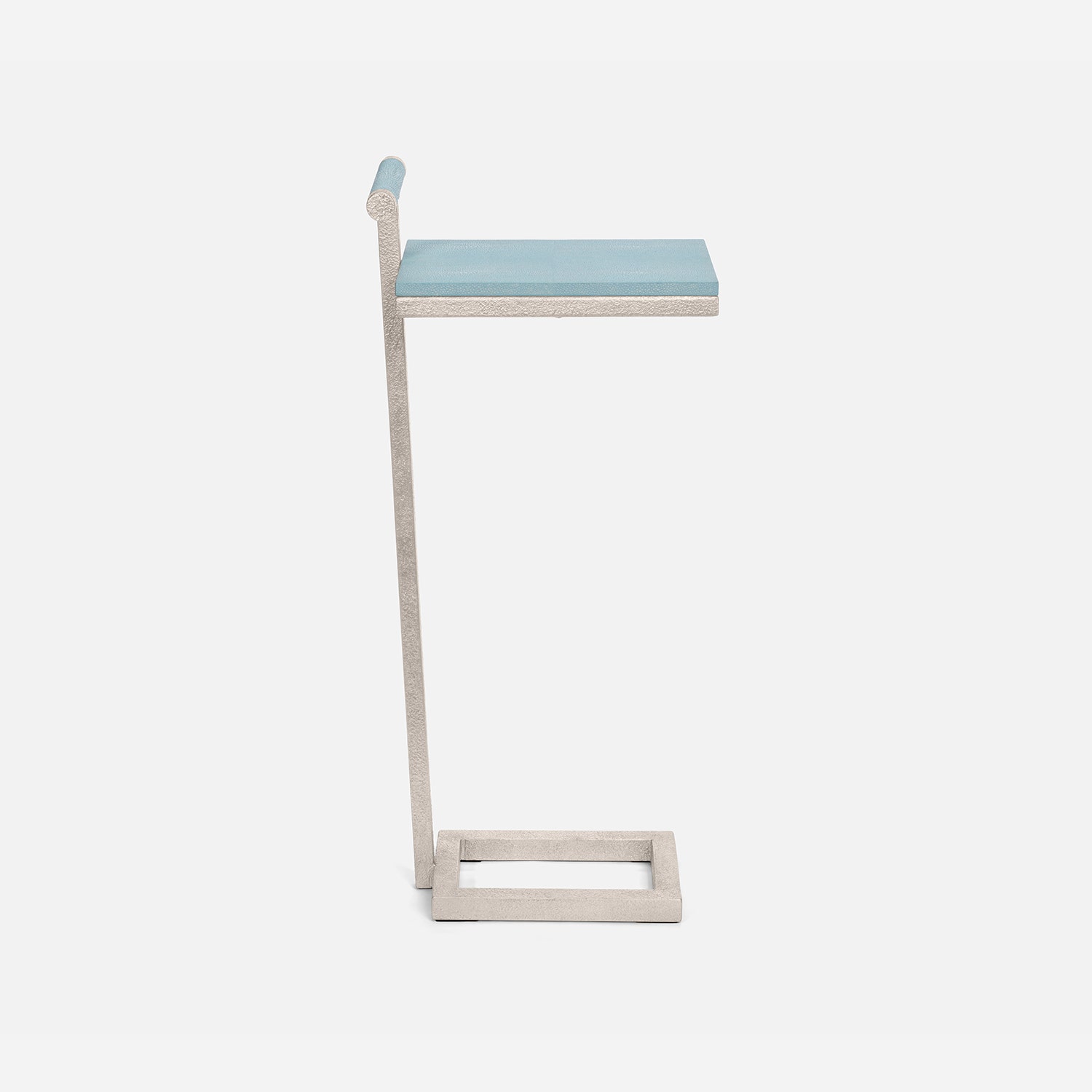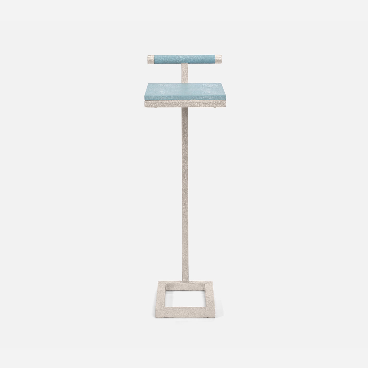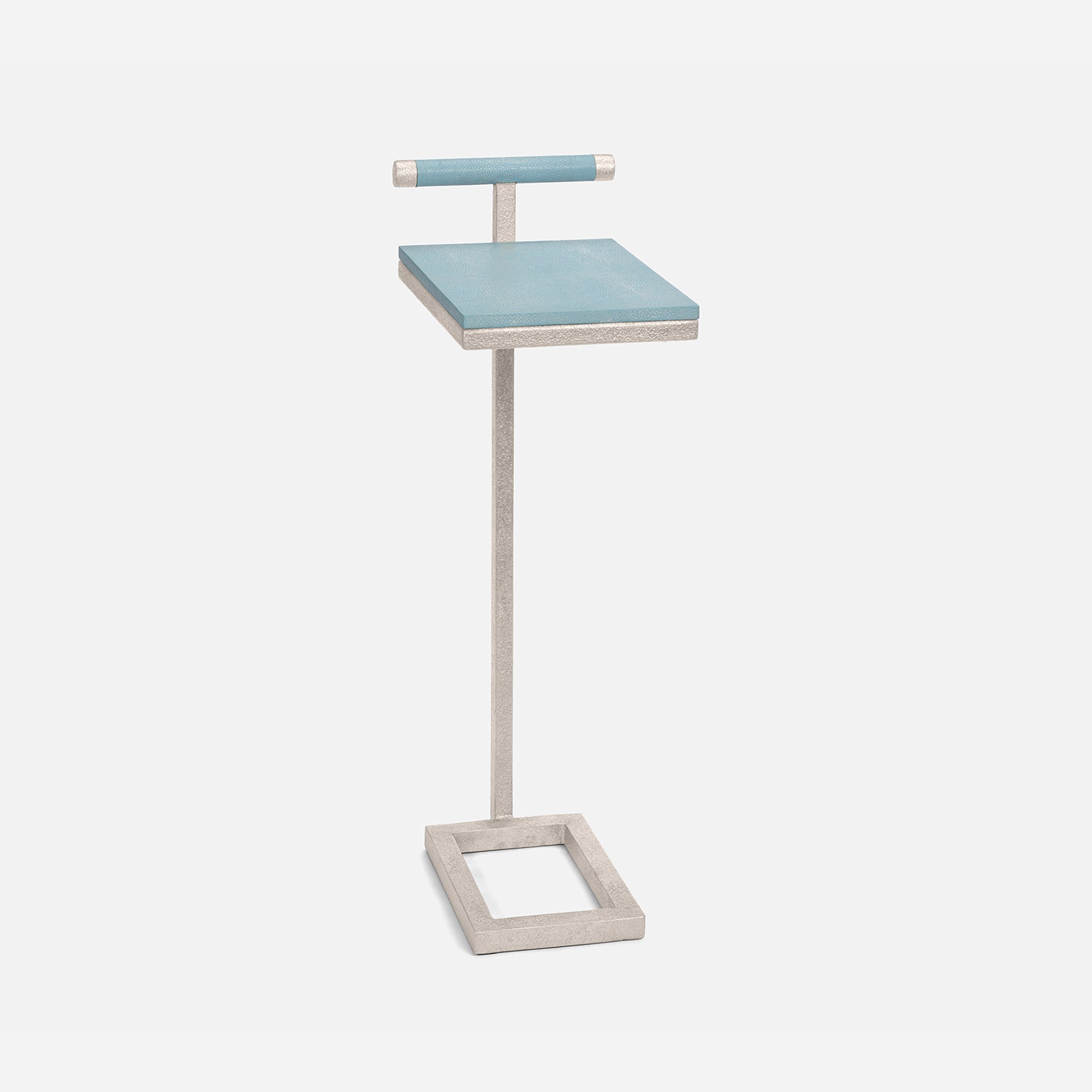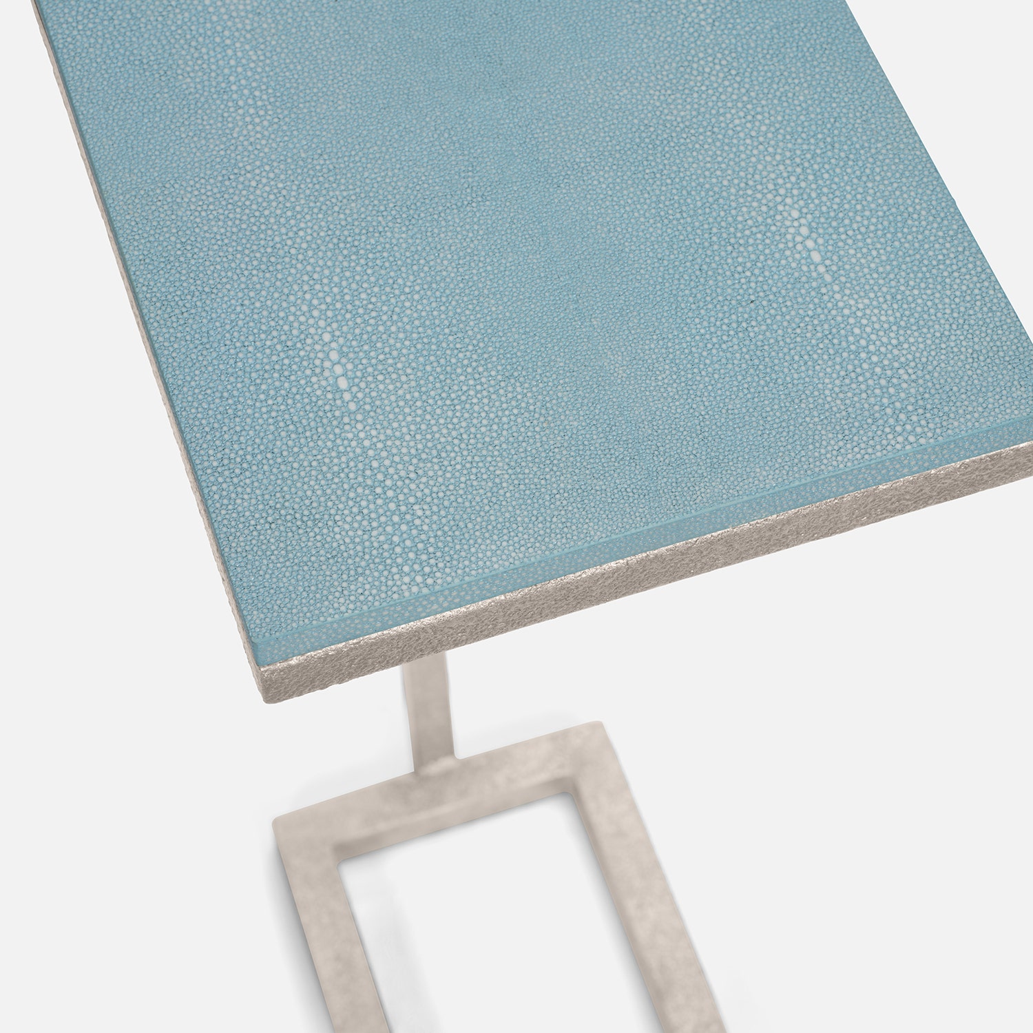 Our extremely portable powder blue accent table is perfect for simple couch-side convenience. A minimal metal base is topped with a faux shagreen panel and handle; use it for drinks, to hold a laptop while working, or to keep anything you need within arm’s reach.