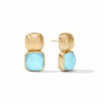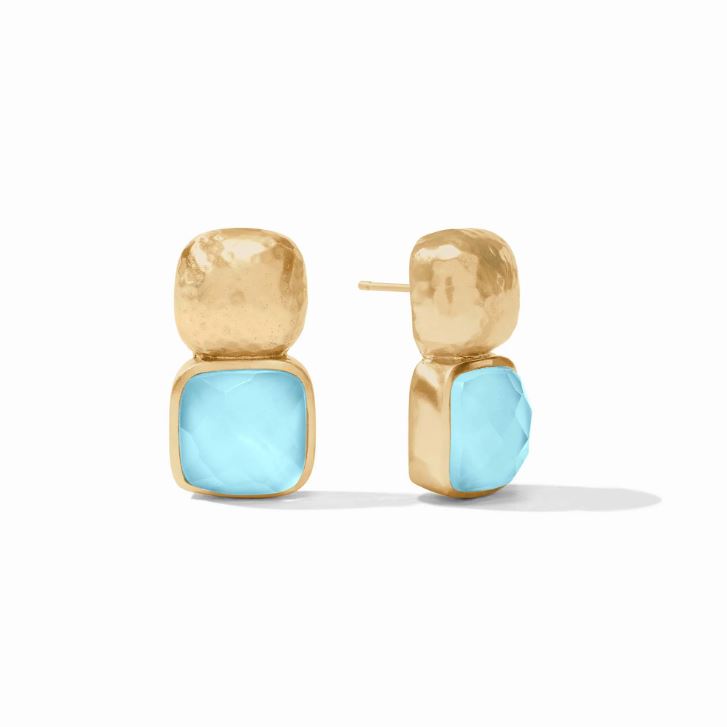 The stacked squares of these earrings—a lightly hammered top above the cushion shape gemstone underneath—comes in a spectrum of sparkling colors.