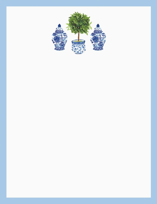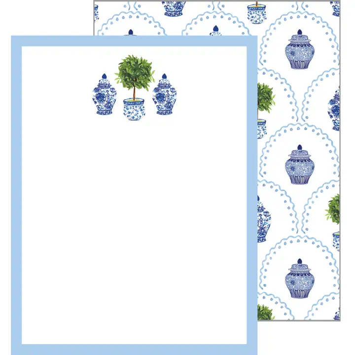 Our best selling product has a darling new design: chinoiserie topiary! This preppy design is printed on each page (a bright white 70# paper) giving you a bright, clear color that is sure to catch attention. They are 100 pages thick and are packaged in a clear cellophane bag and branded belly band.