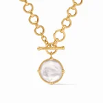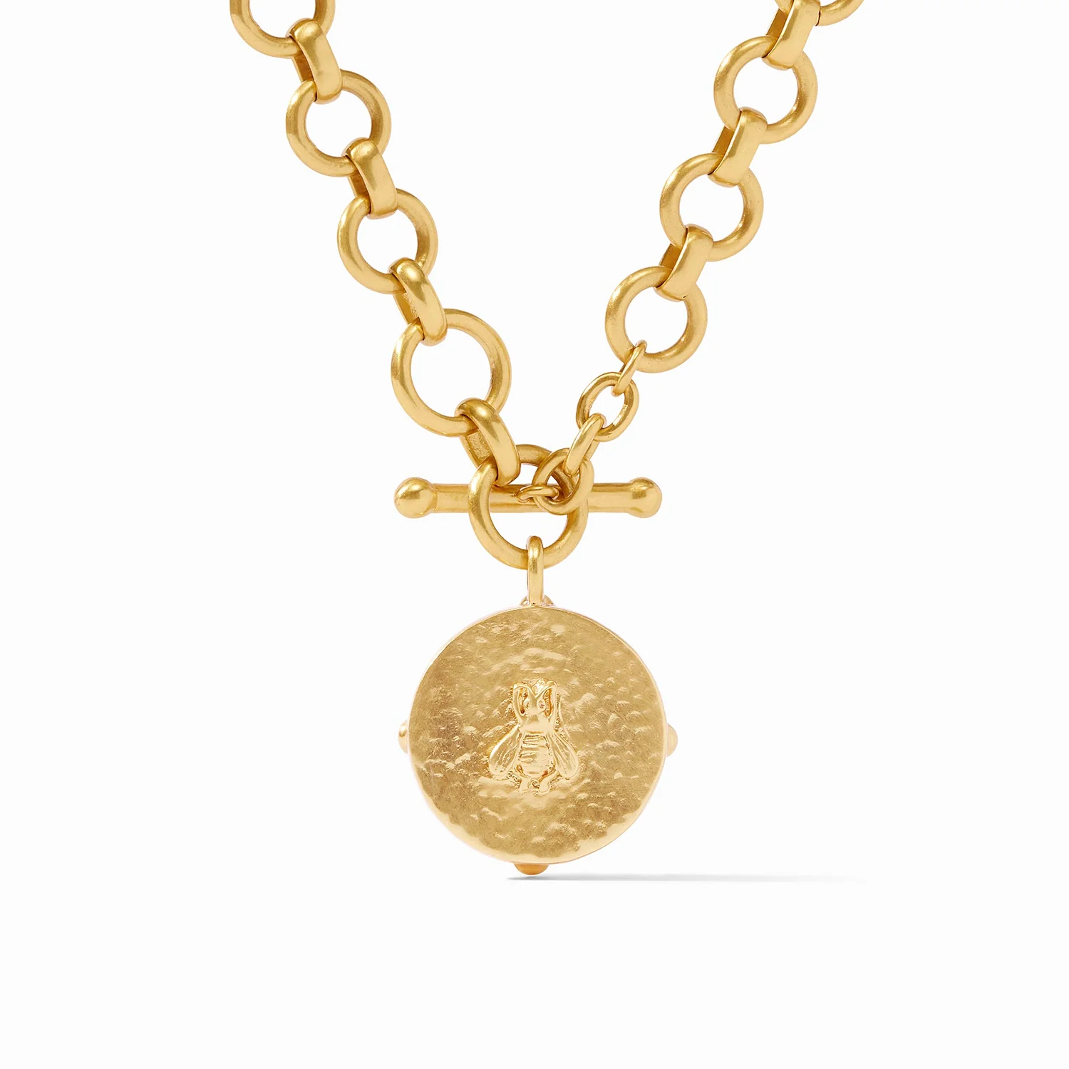 This demi-sized version of a favorite necklace has two ways to wear: Show the rose cut stone accented with golden beads or flip it to display a detailed bas relief bee.