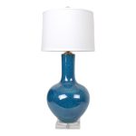 Reproduction porcelain vase lamp with hand-painted blue and turquoise dappled finish. Assembled on an acrylic base with drum shade in white. Features real brass hardware with hand-rubbed antique finish, 3-way turn knob switch, and compatible with 150 watts bulb max.
