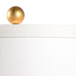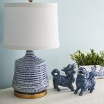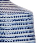 This cobalt blue and white glazed porcelain table lamp features a curved silhouette and texture reminiscent of a beehive. The antique gold leaf base and matching finial add a warm glow while the off white linen tapered drum shade completes this look. The classic colors make this ideal for any table, nightstand or desk in a traditional design scheme.