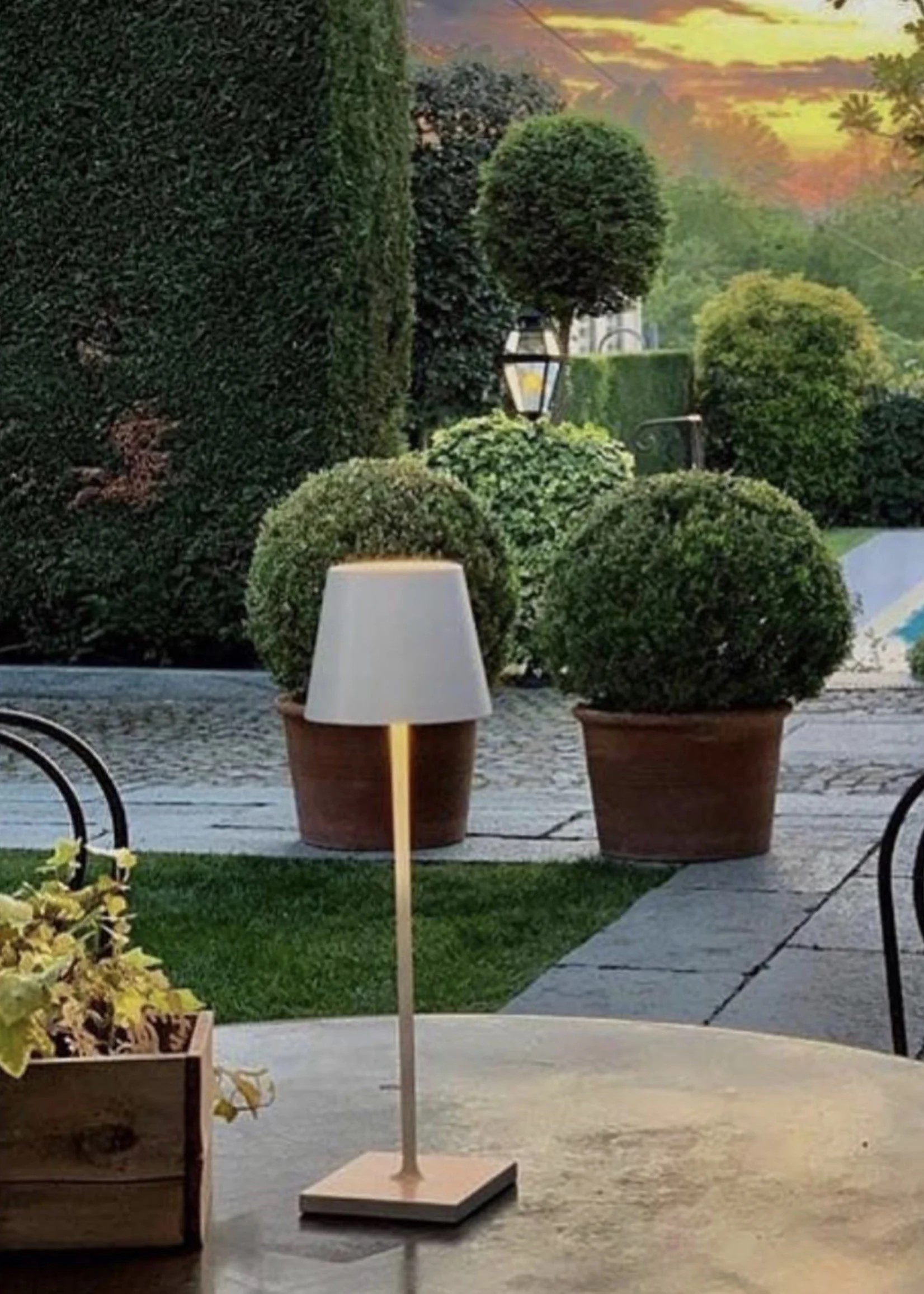 To recharge your Poldina Pro table lamp, plug the provided charging base into an outlet and place the lamp on the base. The translucent top will glow red while charging and turn green once the charging cycle is complete. A full charge takes around 6 hours. The lamp should be removed from the charging cradle when the battery is fully charged.