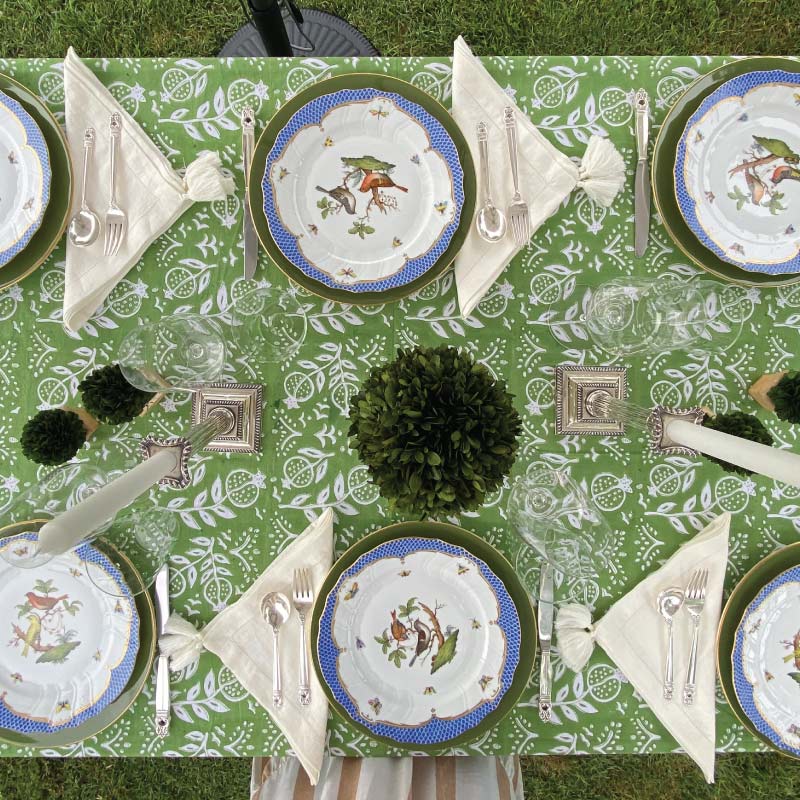 With a play off of our brand’s signature print, Pomegranate Blue, we recolored this print in a new vibrant shade of green. Decorated in a distinctive, handpainted Pomegranate surrounded by lively fleurettes and a complimentary border, these napkins add an at-home and welcoming look to your table setting.